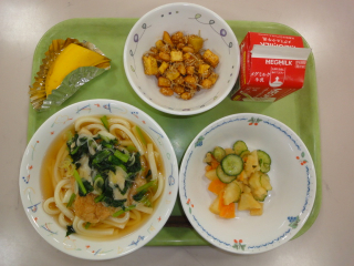 昭和40年頃の給食メニューです。少しずつお皿に移さないと
