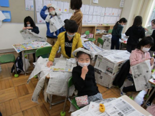 新聞紙を使って造形遊び「しんぶんで なにしよう」をしました。